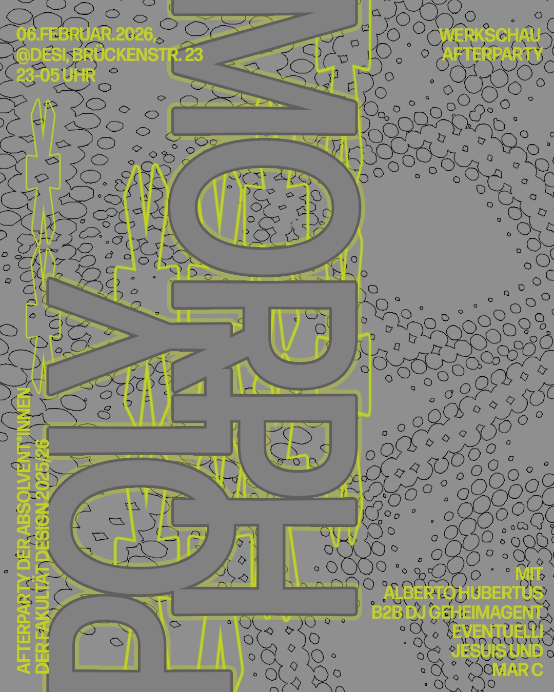 Die Absolvent*innen der Fakultät Design laden ein um ihren Abschluss gebührend zu feiern: Die Nacht steht ganz im Geist des Wandelbaren. Der Raum flackert, pulsiert, biegt und streckt sich – ein paar Stunden so vielseitig wie ein ganzes Semester. Doch den Moment wollen wir festhalten: Nur die Klänge elektronischer Musik versetzen deinen Körper in Bewegung und lassen Perspektiven verschwimmen.